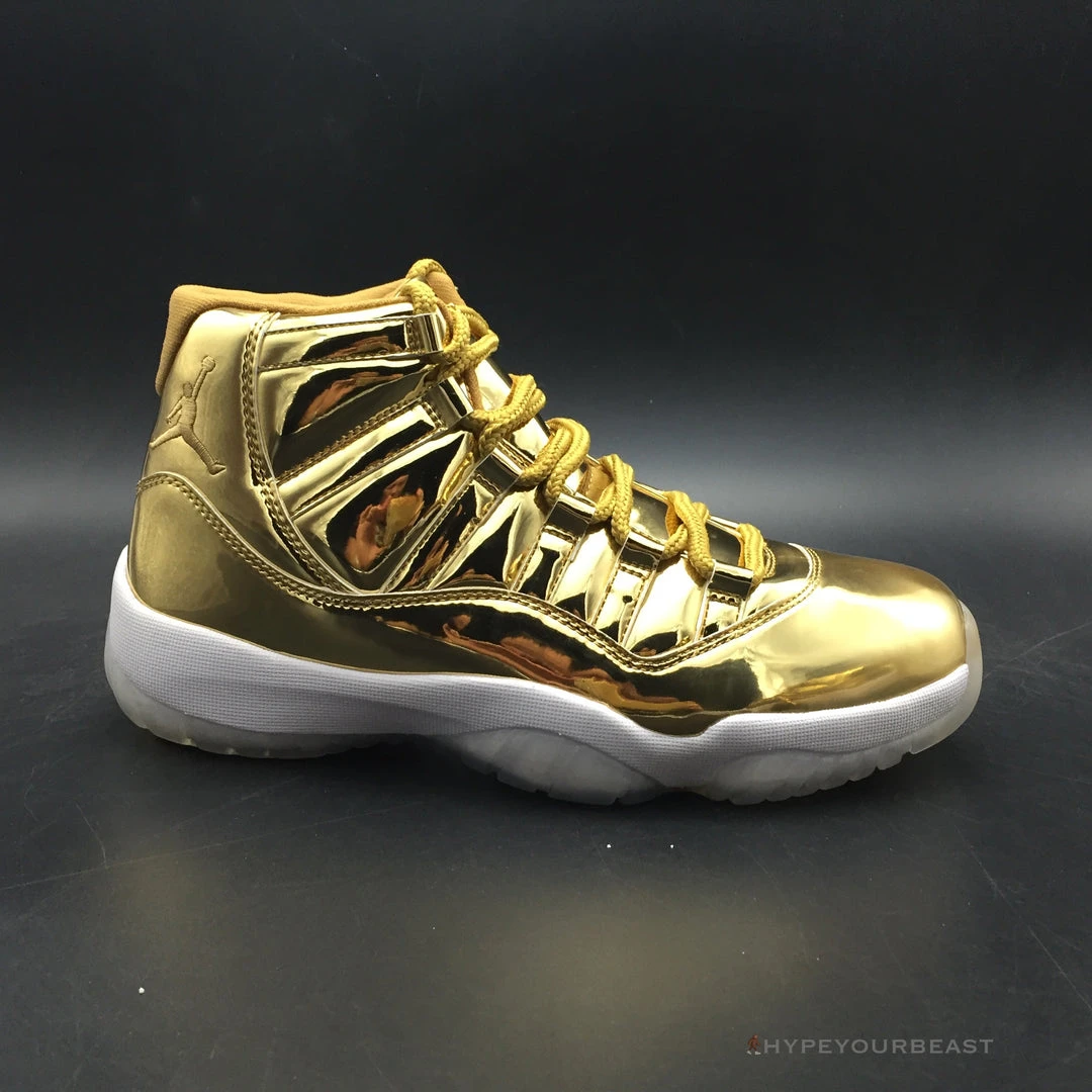 If you love metallic gold sneakers, then you will surely fell in love with Air Jordan 11 Metallic Gold! These sneakers celebrate the Rio Summer Olympics Closing Ceremony through its gold medal colorway. It also uses white mesh material with gold leather overlays making it more bright and shiny on your feet. The sneakers are completed with ice blue translucent outsoles, showcasing the white Jumpman logo under. This footwear is also named Air Jordan 11 Retro Low ‘Closing Ceremony’.