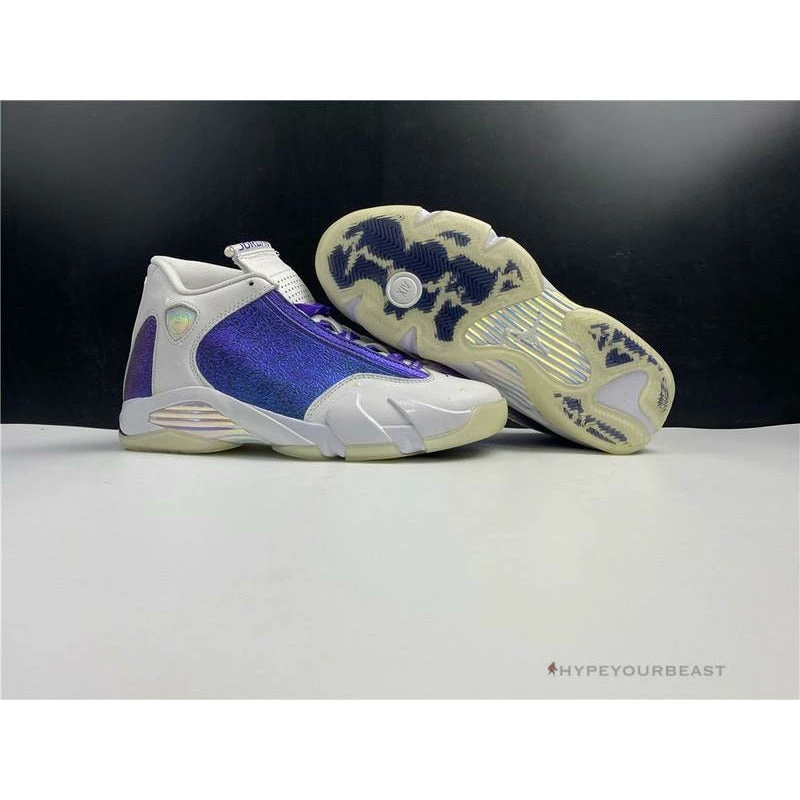 The impeccable Air Jordan 14 White ‘Doernbecher’ brings you white and shining purple to your feet. These sneakers include white nubuck upper with metallic blue and purple panels. You can also enjoy its dashing logos on its ankle collars, heel tabs, and tongue tabs. Additionally, uniquely structured edges are presented on its midsoles and outsoles.