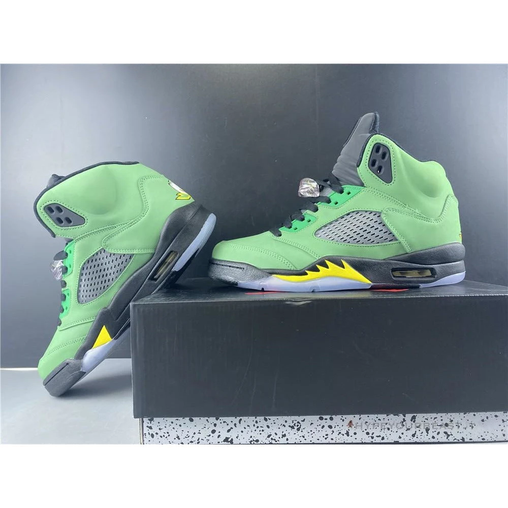 Air Jordan 5 Retro Oregon Ducks are from the main colorway of the University of Oregon Ducks. It owns the apple green shade for the upper’s nubuck material as it has mesh paneling details. It also uses a toggle lacing system, padded ankle collars, and Air technology cushioning. Besides its apple green hues, Air Jordan 5 Oregon Ducks also owns Yellow Strike accents on its shark-tooth feature. Completing its style is the team mascot logo on the heel and large “O” school icon on the tongue.