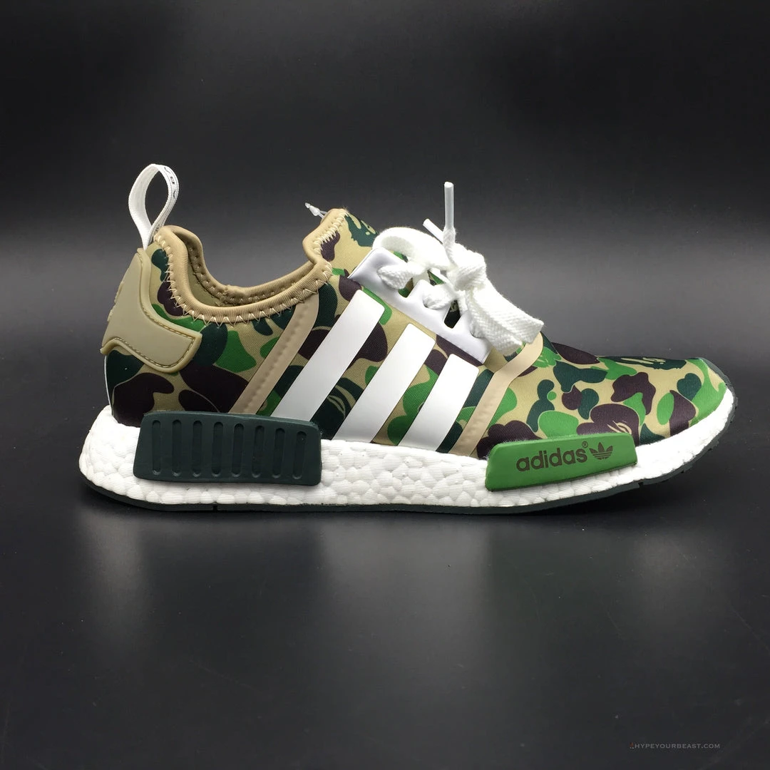 Camouflage sneakers have leveled up its game through the Bathing Ape x Adidas NMD R1 Green Camo which features green and tan accenting. Bape x Adidas NMD fantastic collaboration gave birth to a strongly enhancing pair of sneakers with duck camo style. Besides its green and tan elements on the upper, Bape x Adidas NMD R1 Green Camo also includes Three Stripes on the midfoot. To complete its look, the white boost technology midsoles have a black patch and a green patch with the Adidas logo. Wear these sneakers and feel the integrity of owning a camouflage accessory.