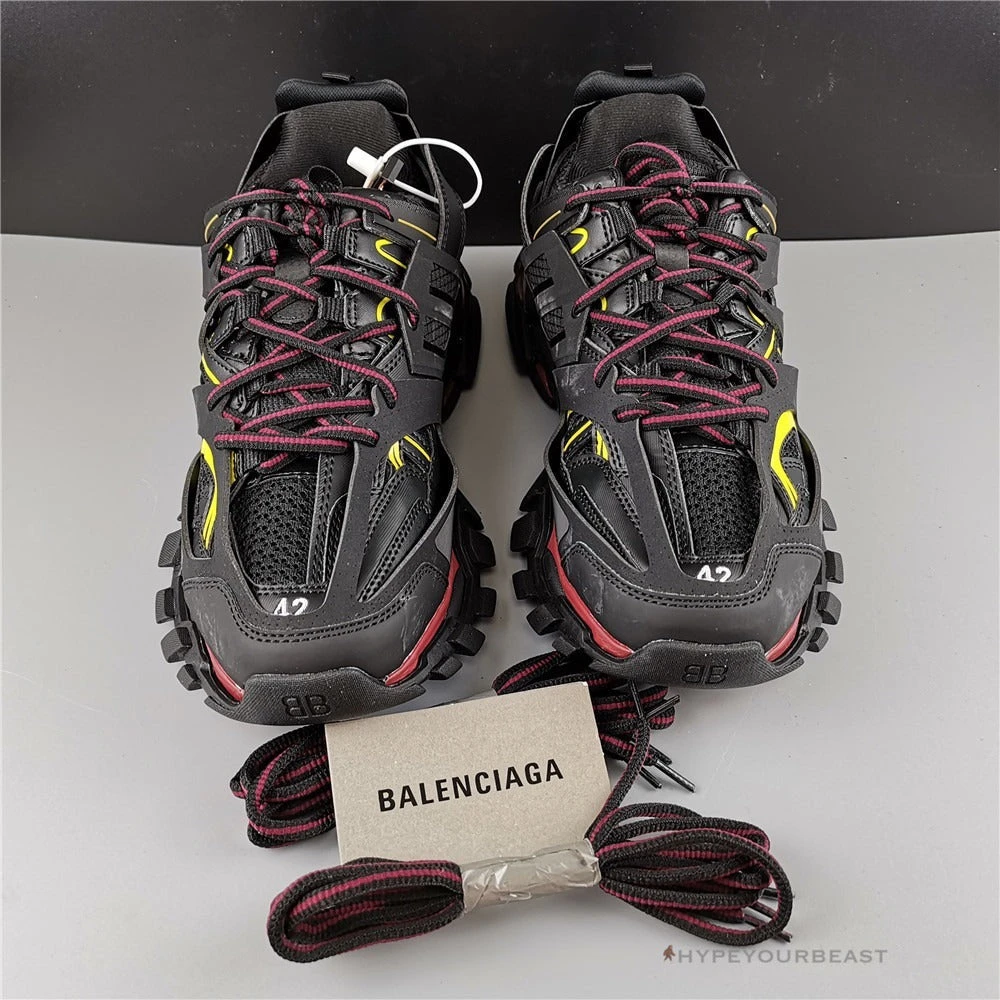 Balenciaga Track Sneakers Black Bordeaux features and sharp look through its black, yellow, and maroon colorway. It has impressive layerings of black and bright yellow on its upper paired with dark maroon laces. Its midsoles also carry strong tones of black and dark maroon red. To further highlight the brand, printed “BALENCIAGA” is seen on the side foot in bright yellow tone and another on tongue area in a clean white tone. Wearing these sneakers can truly boost your feels and confidence as it also features dark maroon red outsoles.