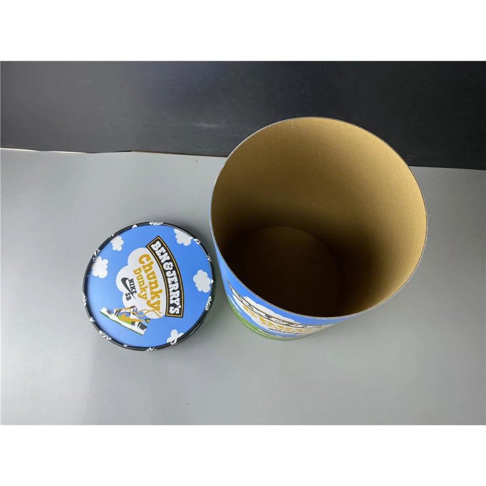 Nike SB Dunk Low Ben & Jerry’s Chunky Dunky includes a special box uniform to the sneakers. The sneakers bring out fascinating leather bases with blue and green cloud designs. Ben Jerry’s x Nike SB Dunk Low also added a cow print canvas for the overlay. Another feature of these Chunky Dunky pairs is the drippy yellow Nike Swoosh. It also owns a white midsole and green rubber outsole. Ben Jerry’s x Nike SB Dunk Low Chunky Dunky comes with a nice special cylinder box. It is very interesting as a gift for anyone.