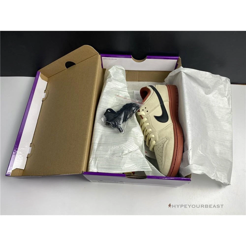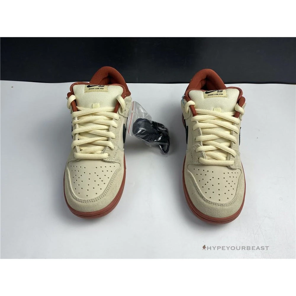 Nike SB Dunk Low Beige color gives extra vintage style on your feet. These sneakers are called Nike Dunk Low Pro Hennessy as it carries beige, black, gold, and maroon colorways. However, its upper only showcases beige bases and overlays. A huge black Nike Swoosh is on each side of the midfoot paired with its black laces. The sneakers include gold accenting on the heel tab highlighting the black Nike logo. To complete the Nike SB Dunk Low Hennessy, maroon interior and thick soles are used. It gives you a chance to nail the old-fashion colorway while channeling its fantastic appeal.
