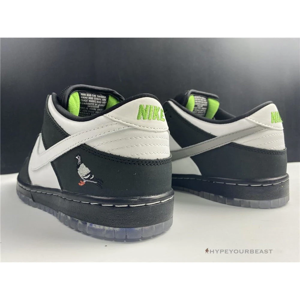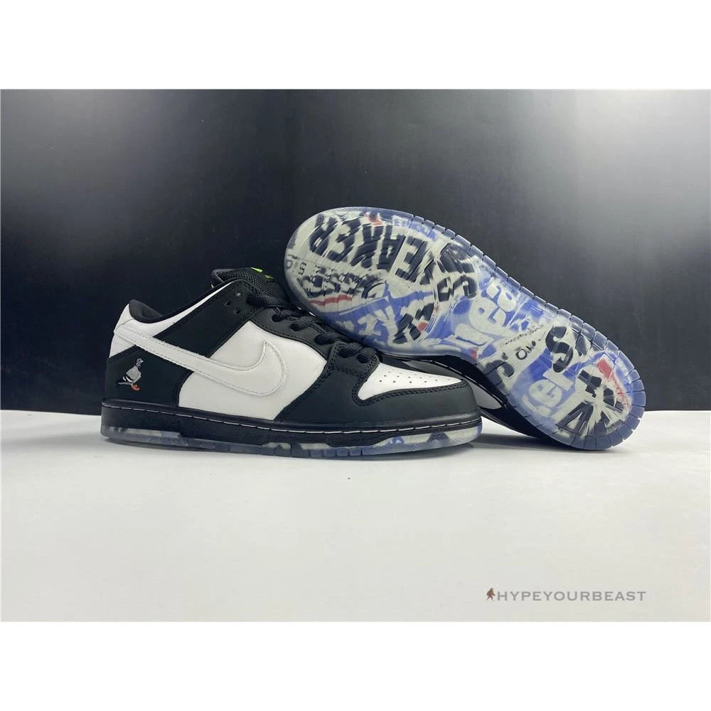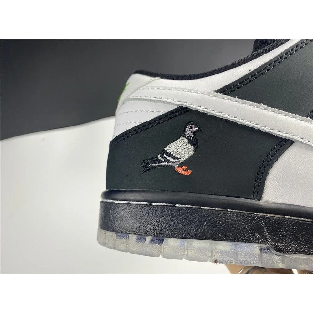 The brilliant collaboration of Nike SB x Jeff Staple Dunk Low Pro resulted in a two-tone Nike SB Dunk Low Pro OG Panda Pigeon sneakers. It showcases white leather bases on its perforated toe, mid-panel, and ankle collars while it carries black canvas on the forefoot, eyelets, and heels. Its tongue and laces are also in black hues paired with its rubber midsoles. However, the white hues are recognizable on its Nike Swooshes on the side panels and another panda pigeon on its lower part. The back of the sneakers reveals white heel tabs with embroidered green Nike labels. Nike SB Panda Pigeon Dunk Low finishes with a translucent rubber outsole with New York Post front page collage.