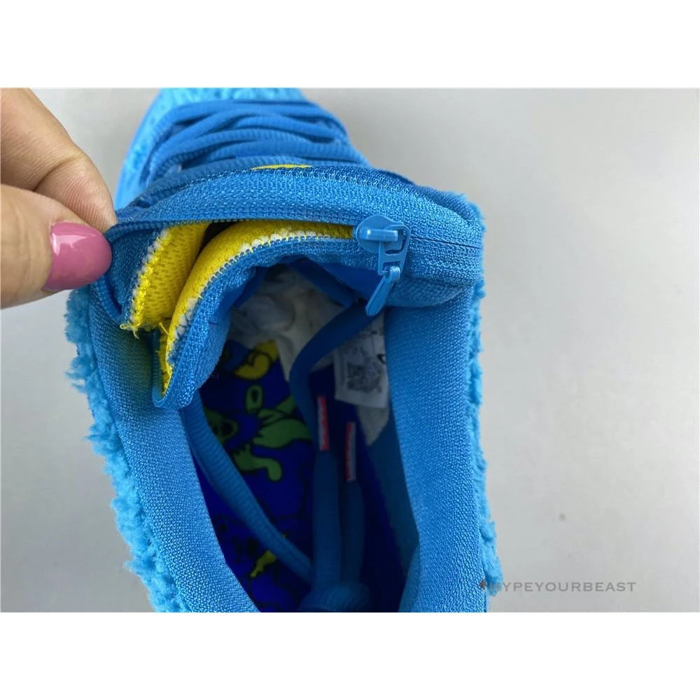 A unique and appealing pair of sneakers is the main goal of the Nike SB Dunk Low Grateful Dead collaboration. They introduce brilliant colorways like the Blue Bear. This pair owns vibrant blue canvas bases with blue faux fur accents on the toe, mid-panel, and ankle collars. It also brightly showcases yellow ragged Nike Swoosh on the sides and yellow rubber outsoles. Nike SB Dunk Low Grateful Dead Blue Bear also features the brandings on the tongue and heels while it maintains its premium quality performance for your feet.