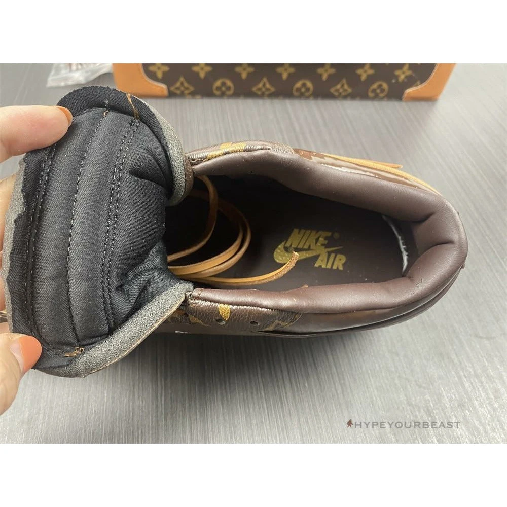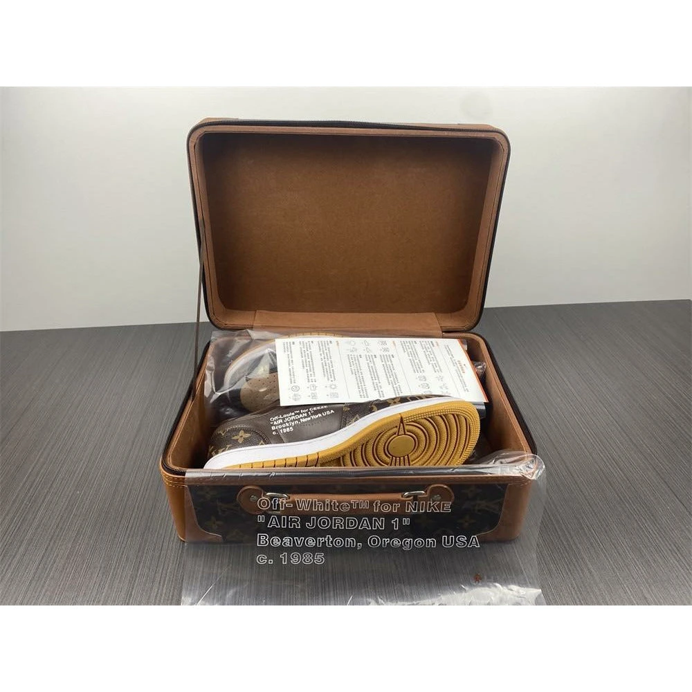 The elegant pair of Off White X Jordan 1 Low X LV brings a grand style to your feet. These low-cut kicks were built from high-end authentic LV leather. The classic sneaker highlights Louis Vuitton’s signature monogram with matching brown accents, wraps off stitching on the swoosh. The designer’s quotation marks, “LOUIS”, and “VUITTON” add finishing the aesthetic design on the midsole.