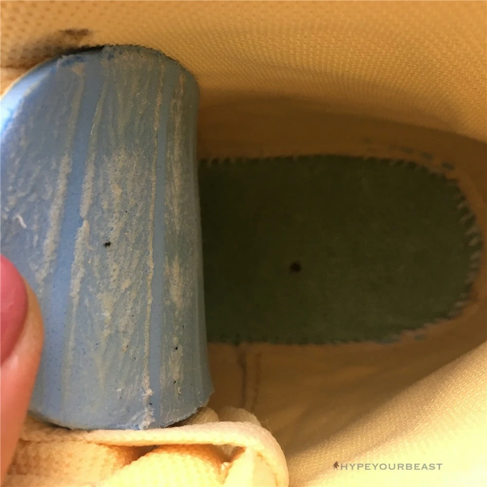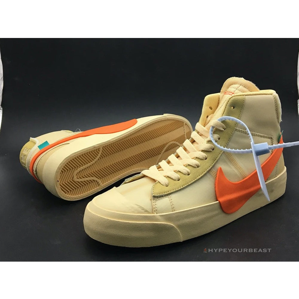 Ravishing Pale Vanilla base colorway with a radiant orange Nike Swoosh is indeed noticeable in the Nike Blazer Mid x Off White All Hallows Eve. This pair nails the Pale Vanilla bases through its low-top upper. It also uses the same colorway on the soles featuring the very huge Nike Swooshes. The medial side of the Nike x Off White Blazer Mid All Hallows Eve includes the iconic Off-white text. The heels are also rocking due to its large heel tabs with Nike label and orange connecting lining of the Swooshes. The pair completes with the lacing system featuring the “SHOELACES” prints.